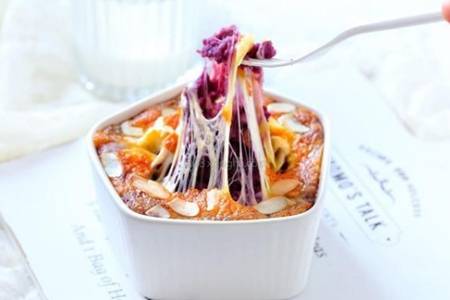 至于芝士焗紫薯的做法是什么?材料:紫薯300克、纯牛奶40克、马苏里拉芝士碎80克、糖10克、杏仁片(可选)适量,步骤如下: