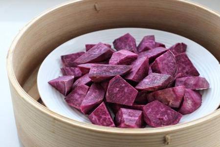 首先,将紫薯洗净后刮去外皮,用刀切成滚刀块或者切片;其次切好的紫薯装进盘中,放入蒸笼冷水上锅开大火蒸约二十分钟,此步骤也可以用微波炉操作;然后,待紫薯软熟后取出放入容器中,用勺子或压泥工具碾压成紫薯泥;